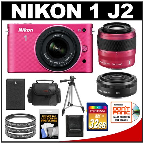 | Nikon 1 J2 Digital Camera Body with 10-30mm & 30-110mm VR Zoom Lens (Pink) with 10mm f/2.8 Lens + 32GB Card + Case + Battery + 3 Filters + Tripod + Wide-Angle & Telephoto Lenses + Accessory Kit #Kit includes:♦ 1) Nikon 1 J2 Digital Camera Body with 10-30mm & 30-110mm VR Lens (Pink)